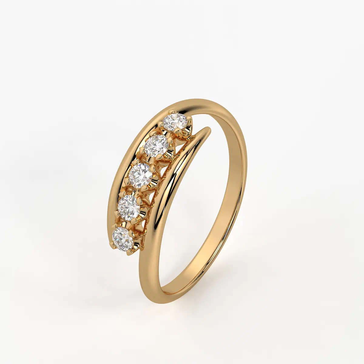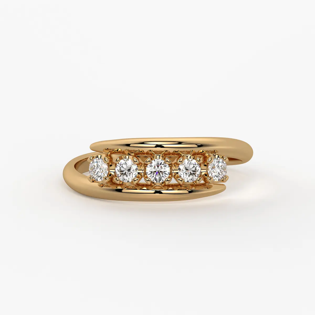A marquise-shaped center stone sits gracefully in a chevron-style setting, creating a sharp and elegant look. The band is lined with small stones that add extra brilliance. Its V-shaped design gives a modern twist, making it perfect for stacking or wearing as a standout piece.
